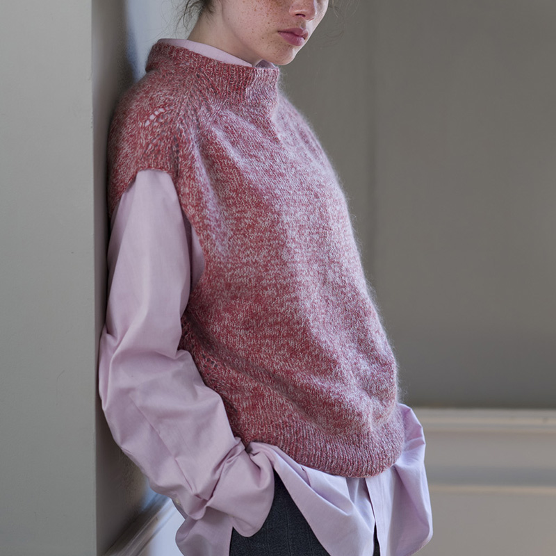 チリペッパー色のシルクに生成りのシルクモヘアを引き揃えることで、豊かなメランジカラーが生まれます。シンプルなメリヤス編みに組み合わせた透かし模様が印象的。ネックから編むトップダウンで、とじはぎも縁編みもなく、編み終わりができあがり。