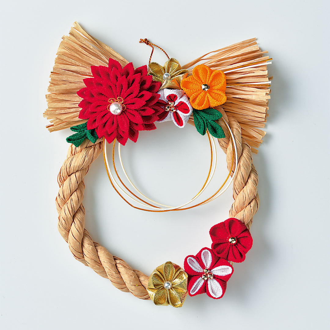 【キット作り方つき】 ペーパーヤーンでしめ縄を作り、つまみ細工の花を飾ります。お正月飾りにお勧めです。