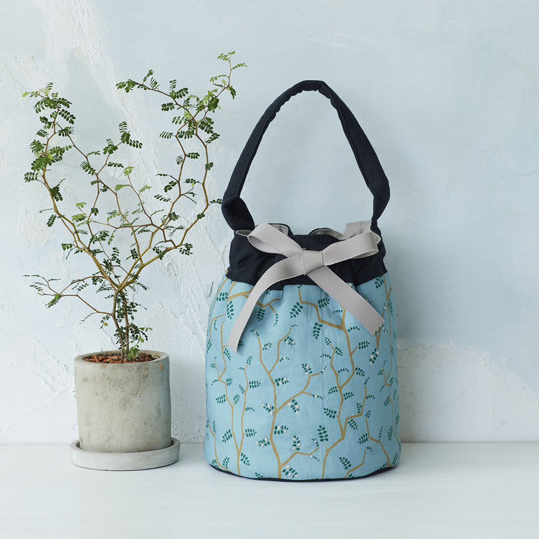 ジグザグに伸びた枝と小さな葉っぱがかわいい観葉植物(リトルベビー)をイメージした“little baby”のプリント柄の巾着バッグです。