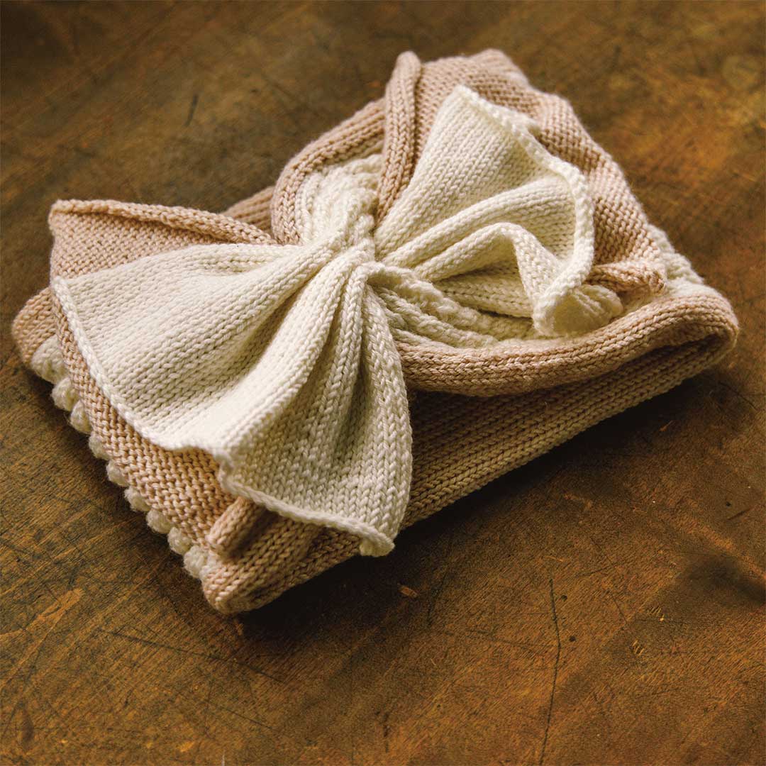 【キット作り方つき】【単品糸購入可】キャンディー包みのような形になる差し込みマフラー。メリヤス編みのベージュ地と斜め模様にした白の編み地を重ね、端の部分を片方の穴に通します。初級の方もOKです。