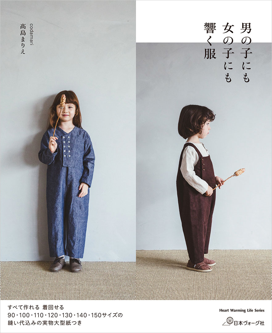 サロペット、つなぎ、プルオーバー、じんべい、コート、パンツ、スカートなどシンプルで作りやすく、さりげなくおしゃれなcodamariらしい作品をたっぷりと紹介します。