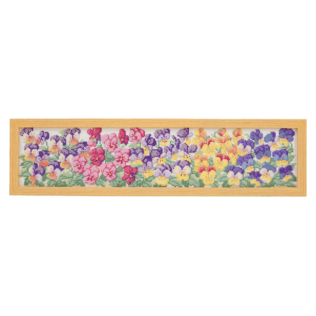 [フレームつき] 【キット作り方つき】色とりどりのビオラがいっぱいに咲く様子を、広がりある横長のデザインで表現したクロスステッチフレームです。所々でラメ糸が輝きます。中級の方向き。