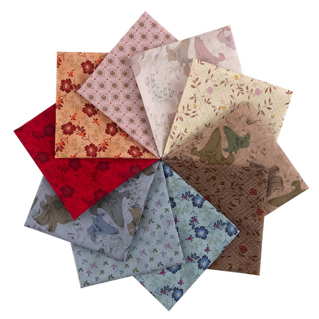 パッチワークにお勧めのシリーズから、ぼかしや地模様の入ったニュアンスのある花柄プリントをセレクト。カットクロスセットでお届けします。