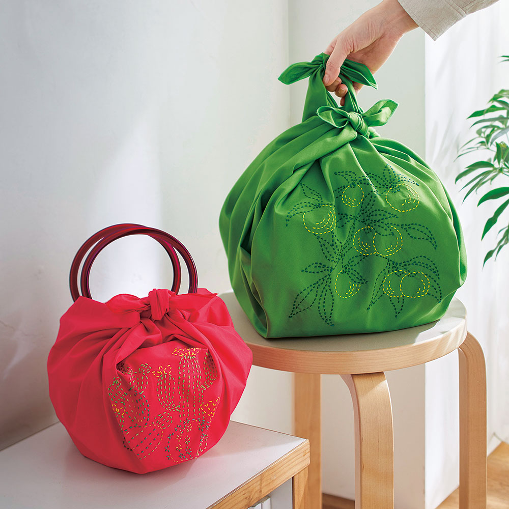 材料セット(縫製済み風呂敷・刺繍糸・持ち手リングなど)、説明書※日本製
