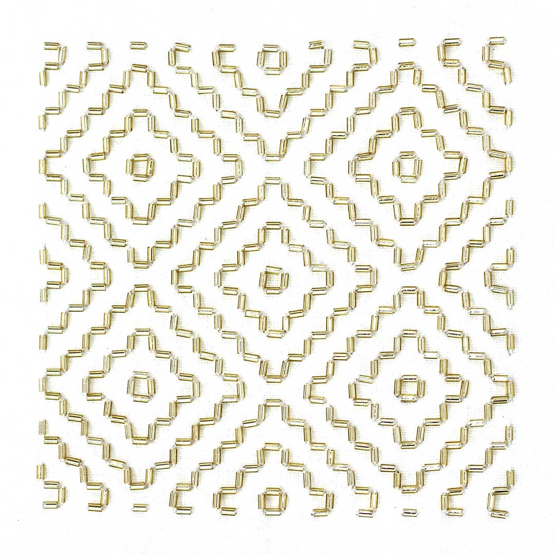 【キット作り方つき】刺し子の伝統柄をビーズ刺しゅうの技法で表現する新しいクラフトです。それぞれ五穀豊 穣・長寿を象徴する[柿の花]と[十字亀甲]の2 種をご用意。図案印刷済みの専用布つきなので、初めての方でも仕上げられます。