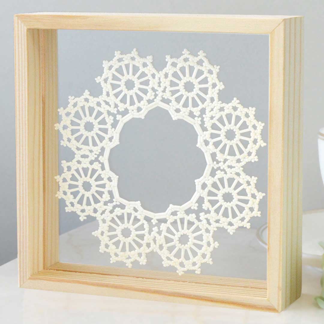 【キットつくり方つき】テグスと針でビーズを編む新しいクラフト「ビーズレーシング」に、レース風の敷物・ドイリーが作れるキットが登場しました。敷いて使う他、別売りの専用スタンドに入れて飾っても楽しめます