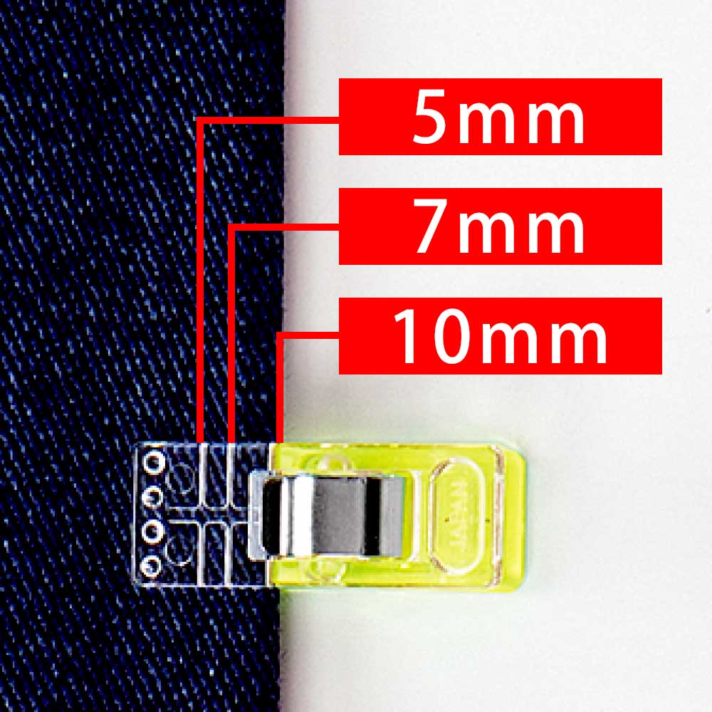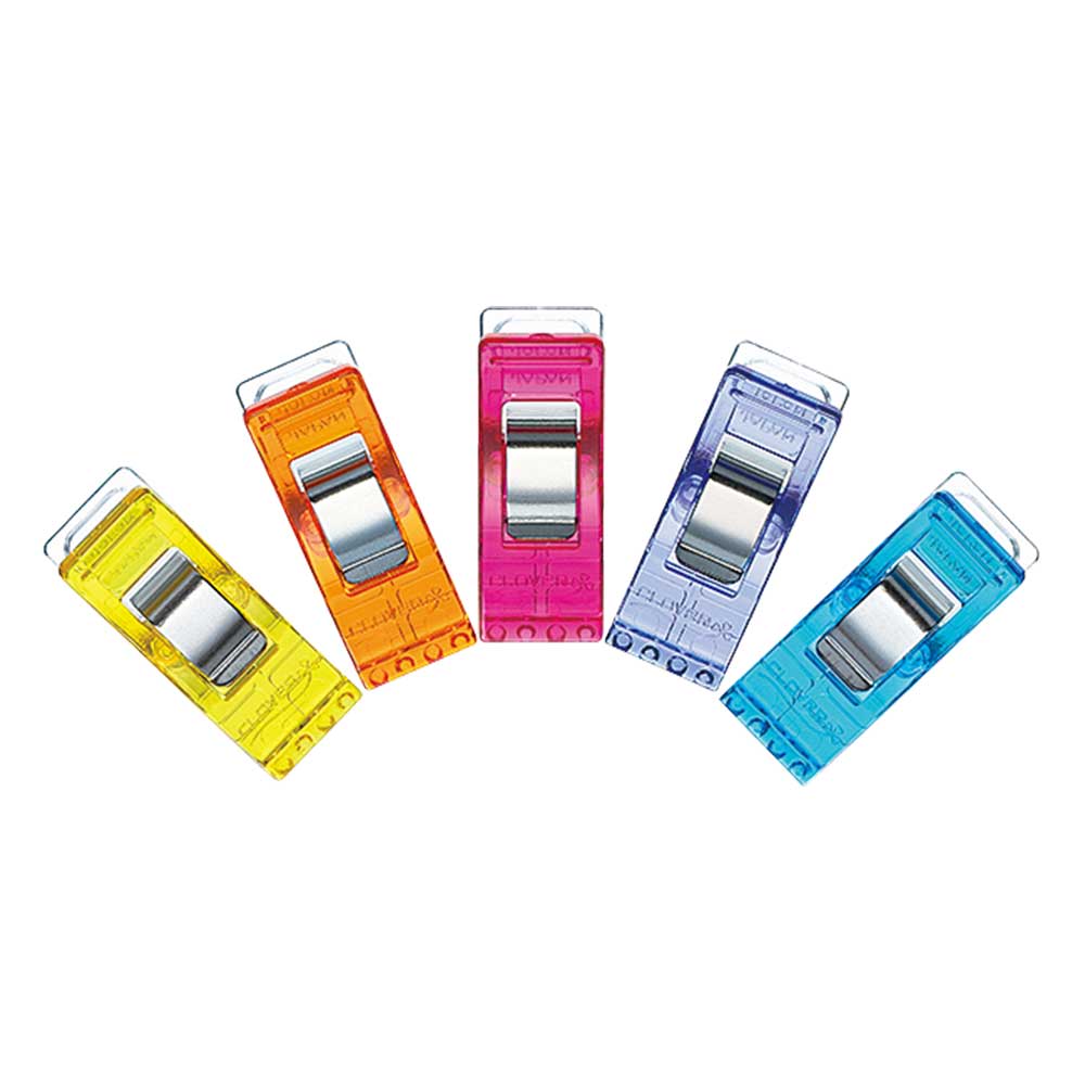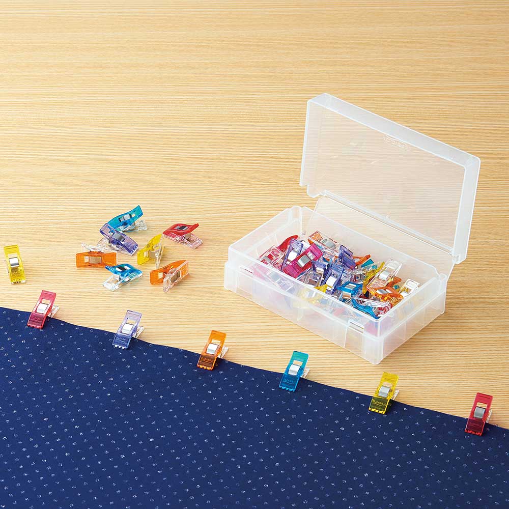 ソーイングの様々なシーンで活躍する仮止めクリップ。使い分けに便利な5色イエロー・オレンジ・マゼンタピンク・バイオレット・ブルーが各10個入って、便利なケース付きです。まち針で止めにくいラミネート加工布や革、厚地の布などをしっかりと固定します。外し忘れがなく、落としても見つけやすいから安心。パイピングやぬいしろの重なり部分、はぎ合わせなど、生地が何枚も重なっているところの仮止めに。ファスナー、ふちどりテープ、厚地の仮止めにもオススメです。