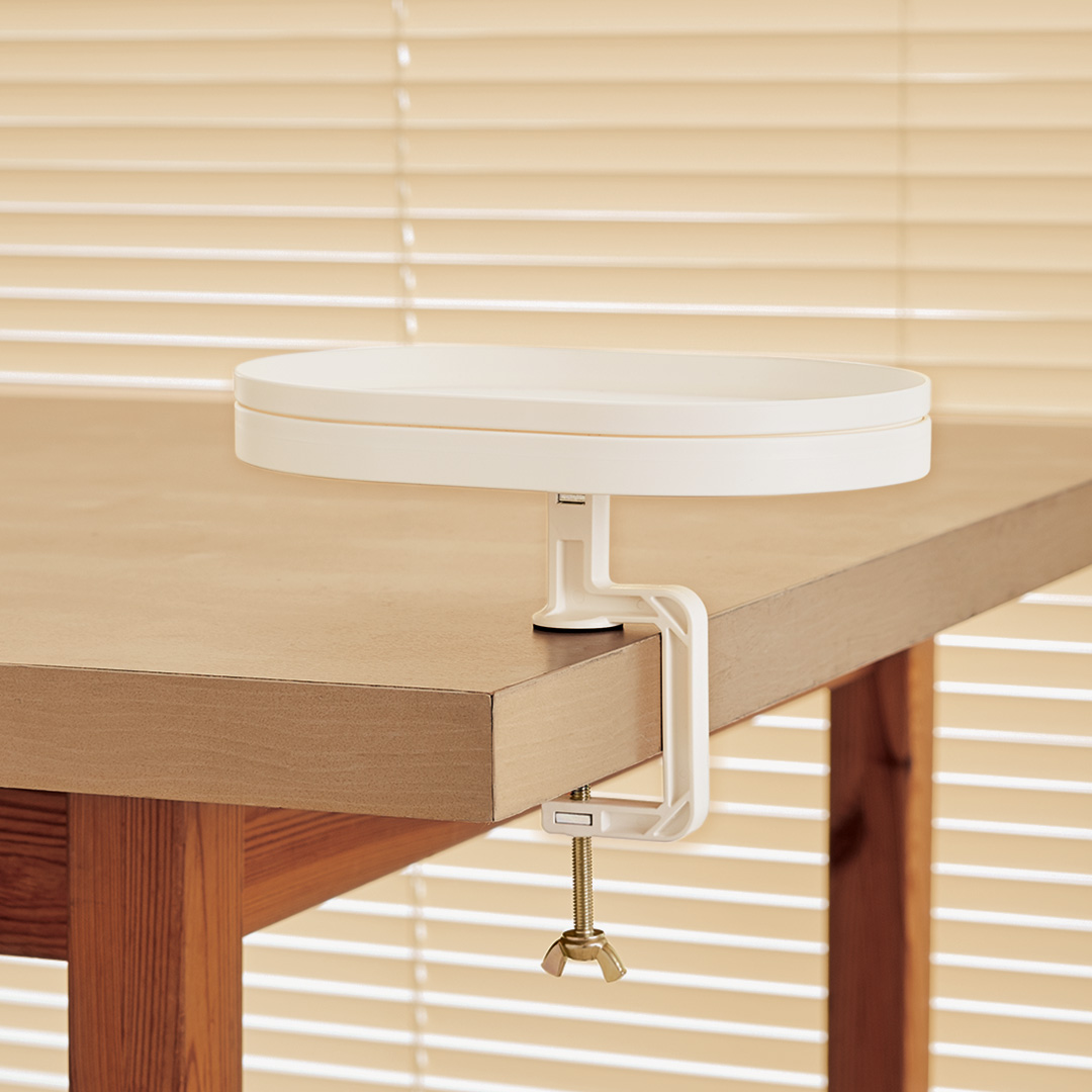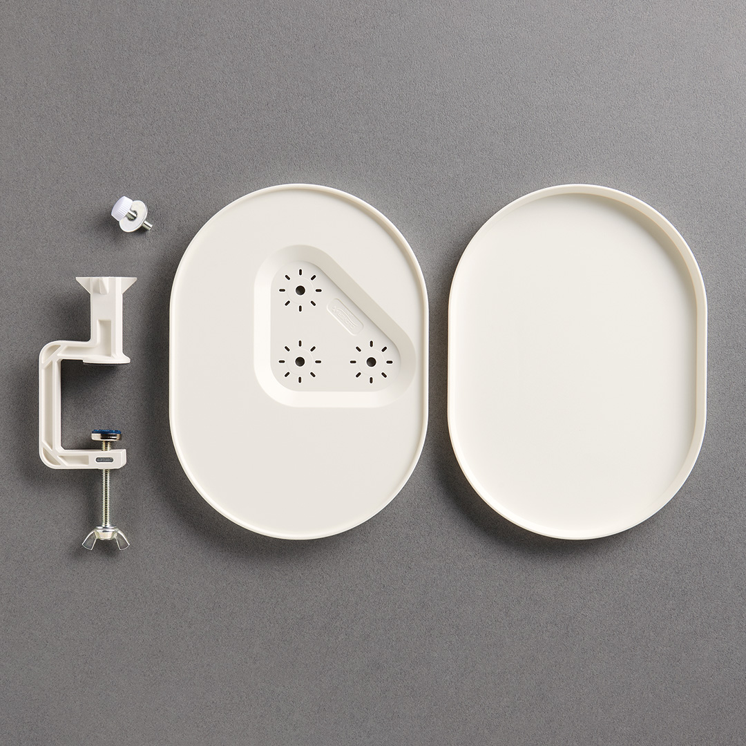 クランプ(ネジ留め式の固定金具)でかんたんに設置できるトレー。