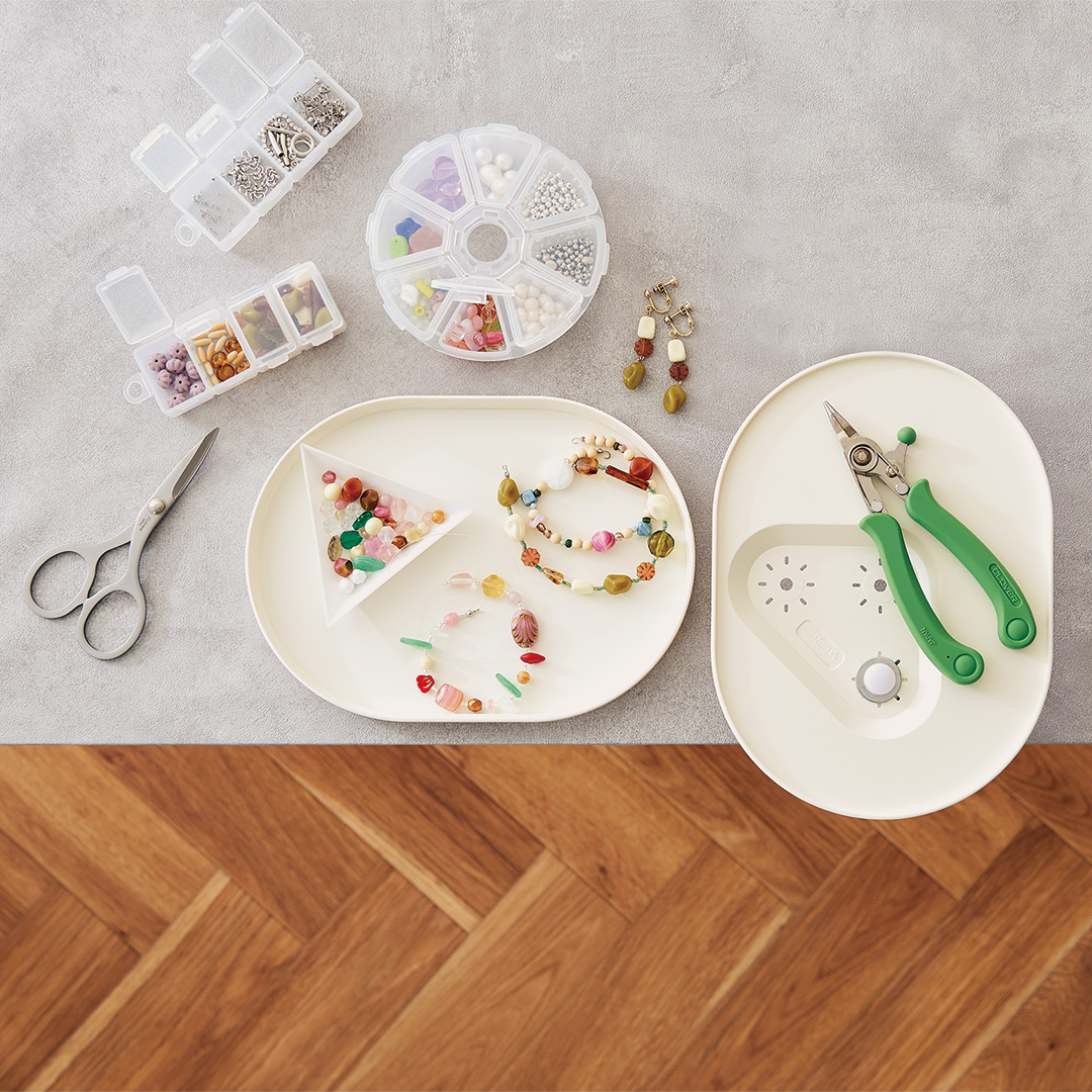 小さなパーツや道具類で散らかりがちな机を整えて作業効率もアップ。トレーは角度を変えられ、トレーのみ取りはずせるので便利に使えます。