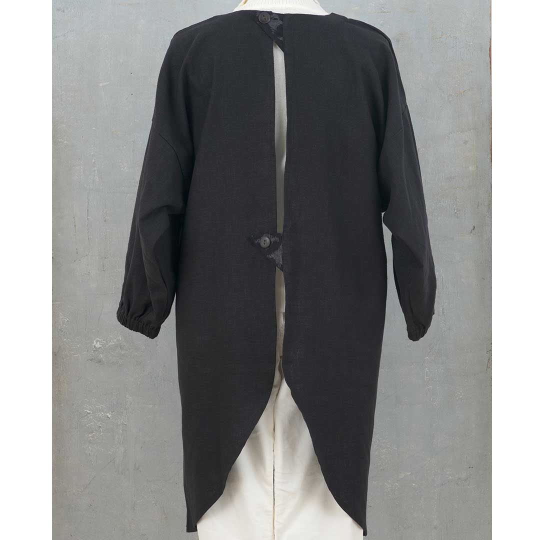【限定10】【完成品】本体は麻素材、ポケット部分に久留米絣をあしらった和モダンテイストのエプロンドレスを2種 ご用意。しっかりとした地で膝まで暖かくカバーします。袖口は掃除や家事もしやすいゴム仕立て。