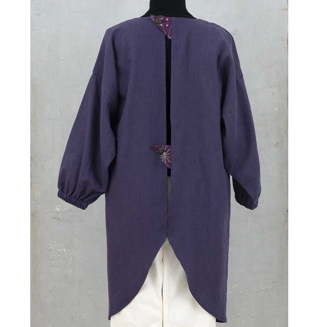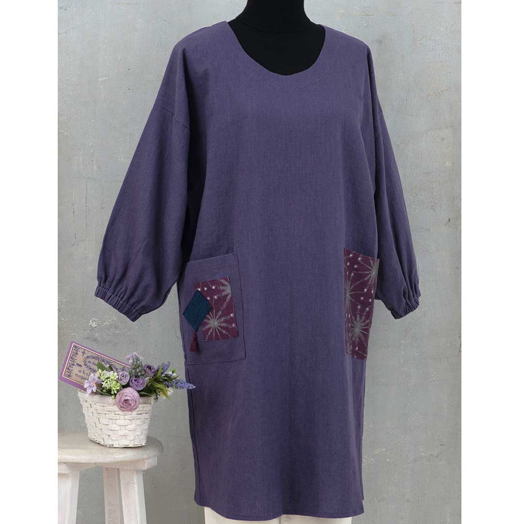 【限定10】【完成品】本体は麻素材、ポケット部分に久留米絣をあしらった和モダンテイストのエプロンドレスを2種 ご用意。しっかりとした地で膝まで暖かくカバーします。袖口は掃除や家事もしやすいゴム仕立て。