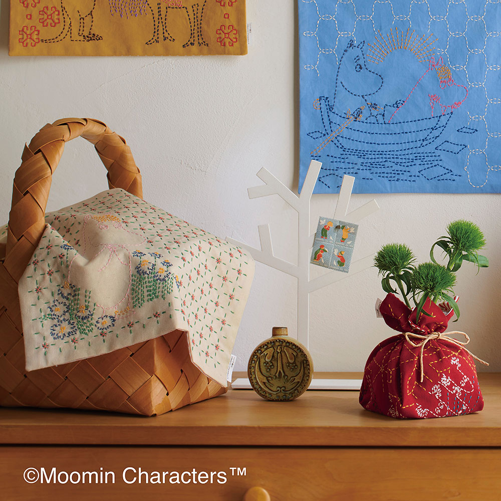 リトルミイやスニフ、スノークのおじょうさんなどかわいいキャラクターたちの印象的な場面と和の文様を刺し描きます。カラフルな糸や裏布で、とびきり華やかなふきんに。約30×30cmの使いやすいサイズなので、壁に飾ったりかごの目隠しにしても素敵です。