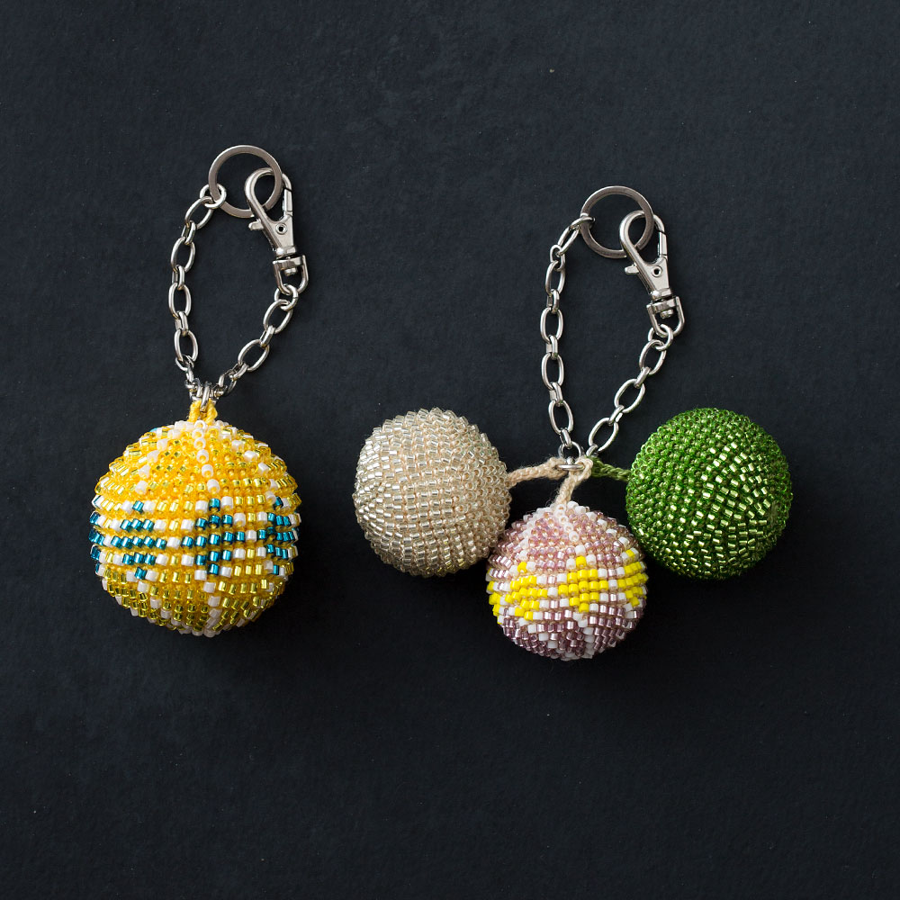 ビーズを全体に編み込んだり、模様にしたり、ポイントに光らせたりしながら、バッグや球体のチャーム、がま口など、おしゃれでかわいい小物を作ります。