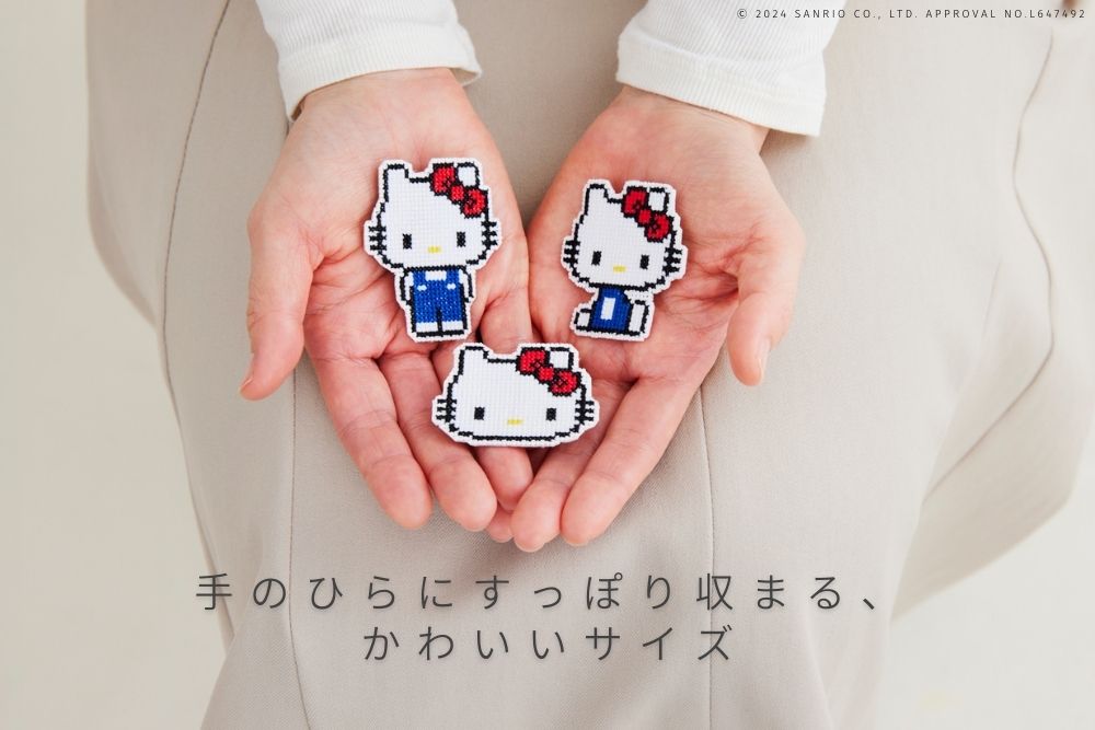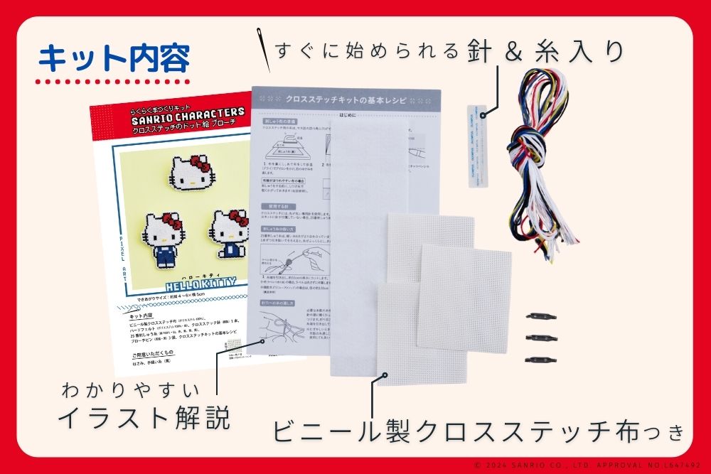 クロスステッチで、ハローキティのブローチが3つ作れるキットです。