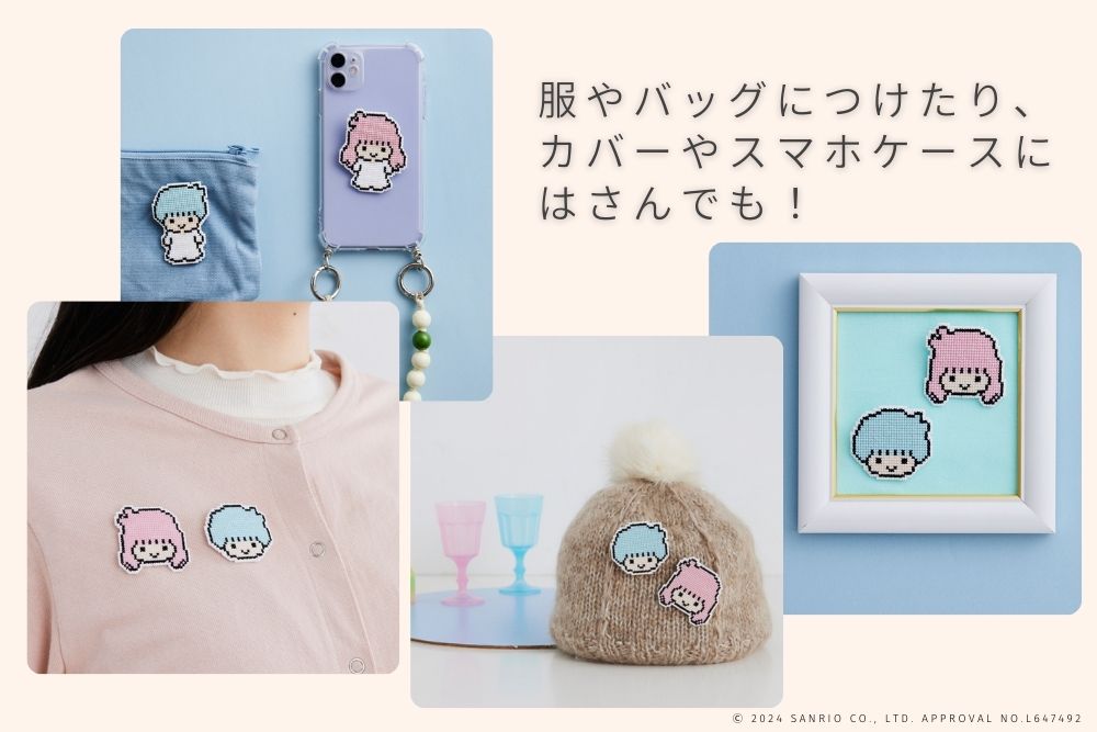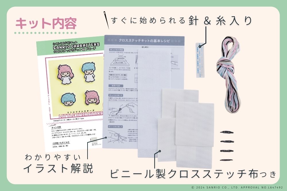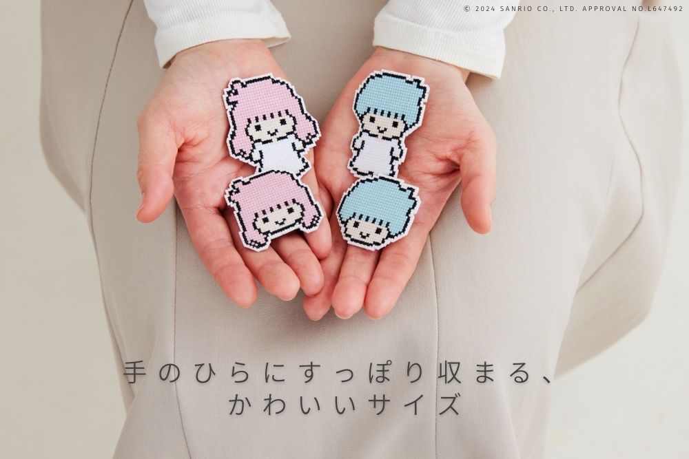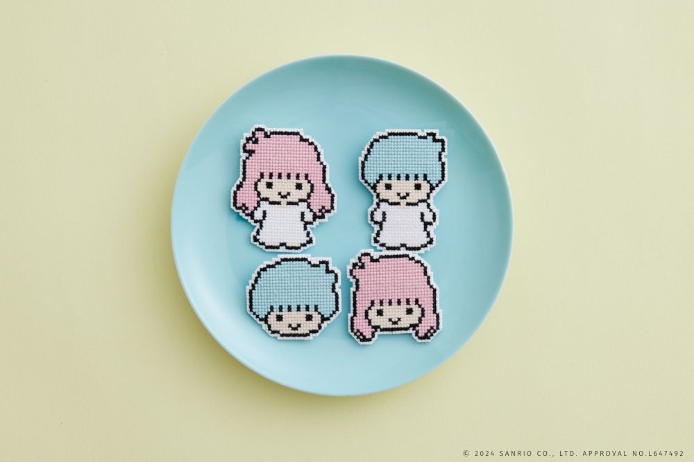 クロスステッチで、リトルツインスターズのブローチが4つ作れるキットです。
