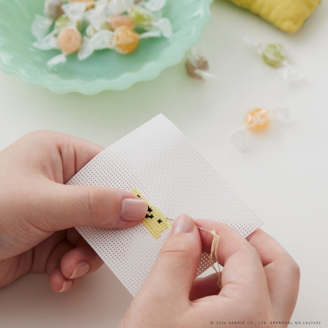 完成したとき、カクカクとしたデザインがしっかり再現できるように、ビニール製のクロスステッチ布をセレクト。カットしたままでも、端がほつれず、仕上がりがきれいになるようにこだわっています。 またセットの刺しゅう糸も、美しい光沢感のある糸をセレクトしました。