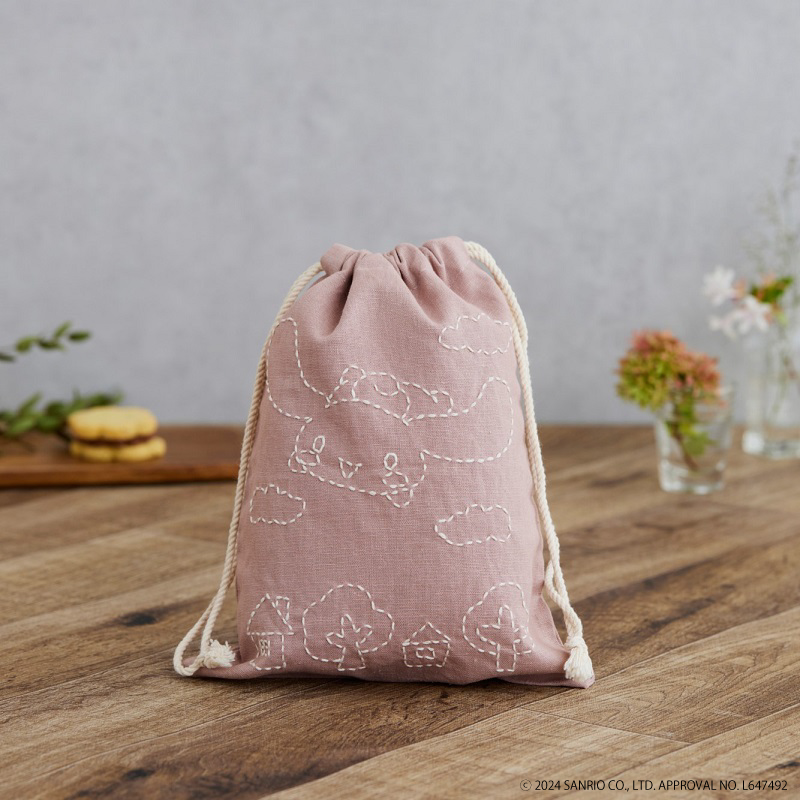 針通りの良いコットンリネンの生地でくすみカラーのピンクをセレクトしました。 作りかけのふきんと針とハサミを入れて、持ち運びができるのでプロジェクトバッグとしてご使用いただけます。 同じシリーズの「シナモンのふきん」と組み合わせて持ちたい巾着です。