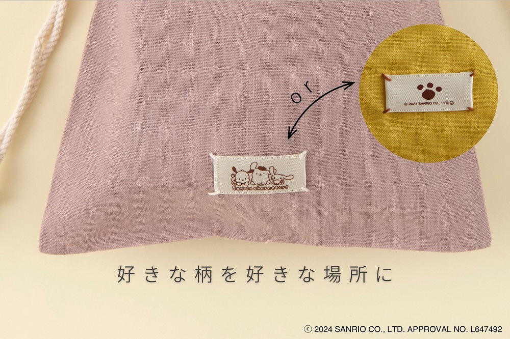タグにはポチャッコ、ポムポムプリン、シナモンの3キャラクターたちが仲良くよりそったイラストをあしらっています。肉球のイラストとどちらか選んで好きな柄を縫い付けましょう。