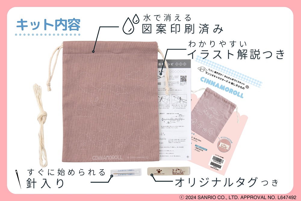 巾着には、水で消えるインクで図案が印刷されています。 刺し終わったあと、余計な線が残らずに、正確に刺せるので、初心者さんでも手間なくかわいく仕上がります。 機械で大量にプリントをせずに、一枚一枚、手作業で丁寧にプリントがされています。 この工程を経て、図案の書き写しをせずに、キャラクターたちの本来の表情を 届いたらすぐに刺し始めることができます。
