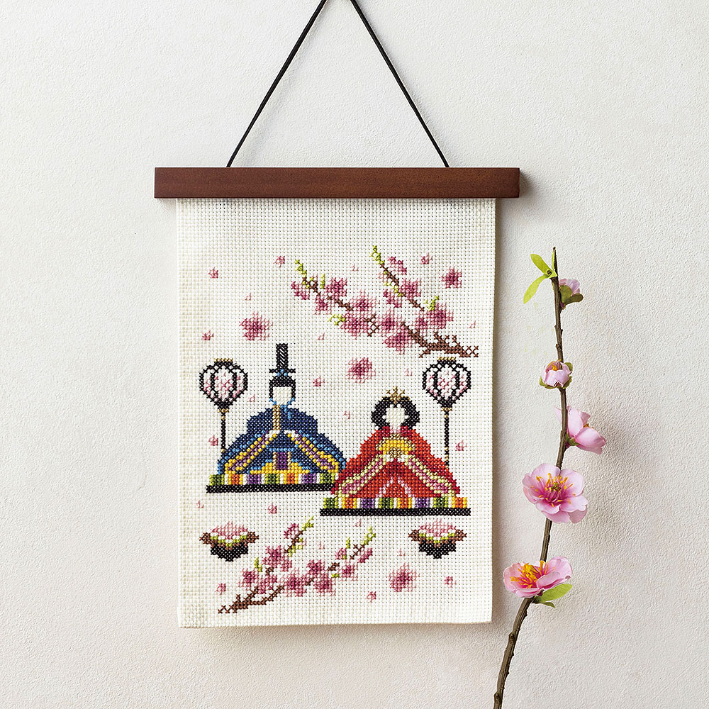 [ウォールバーつき]ひな飾りと桜をクロスステッチで表現した、シンプルに美しい節句タペストリー。お部屋のインテリアに合わせやすいい、シックな木製ウォールバーで仕立てるので、モダンな雰囲気になり、玄関・リビング・和室なそ場所を選ばず飾ることができます。ウォールバーは、マグネットで挟んで使用します。初~中級の方向き。