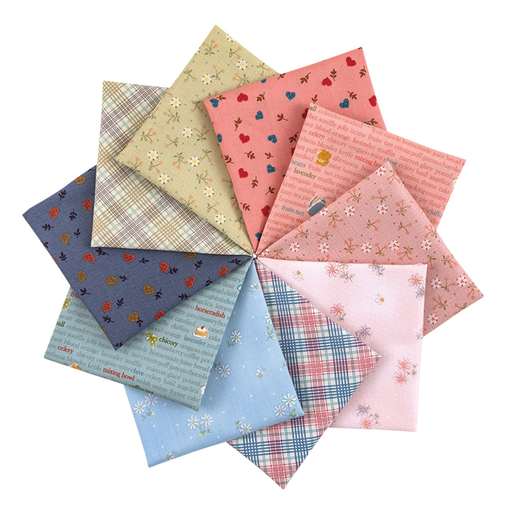 小花や英字、ハートモチーフなどをカントリーテイストの色合いでプリントしたコレクション。ピンク・ブルー・グリーンでまとめたカラフル系のセットです。