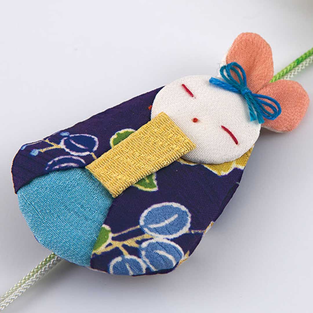 【キット作り方つき】【古裂】小さなウサギの内裏びなと装飾品を1本にまとめた、つり下げて楽しめる桃の節句飾りです。