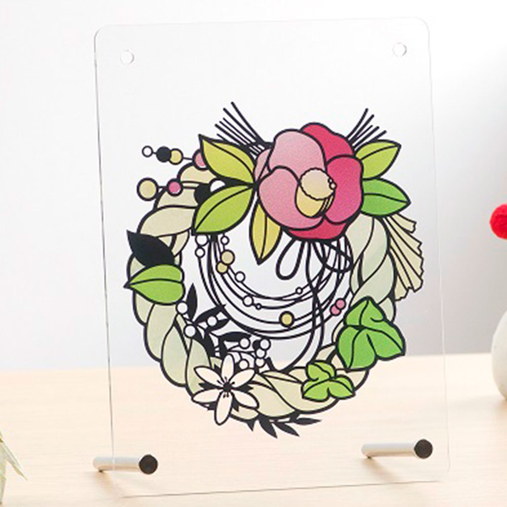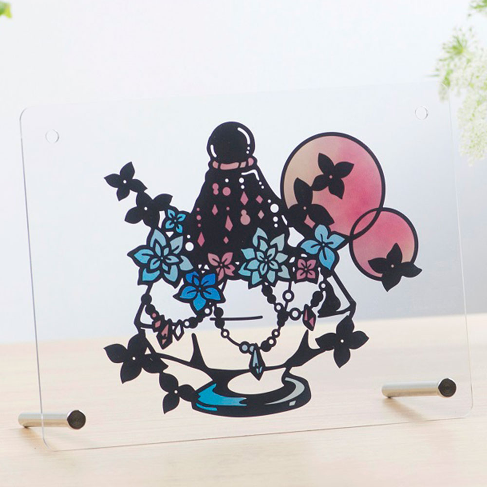 デザイン画が印刷された樹脂板にカラーフィルムを切って貼る、繊細な切り絵風作品づくりを楽しむことができます。