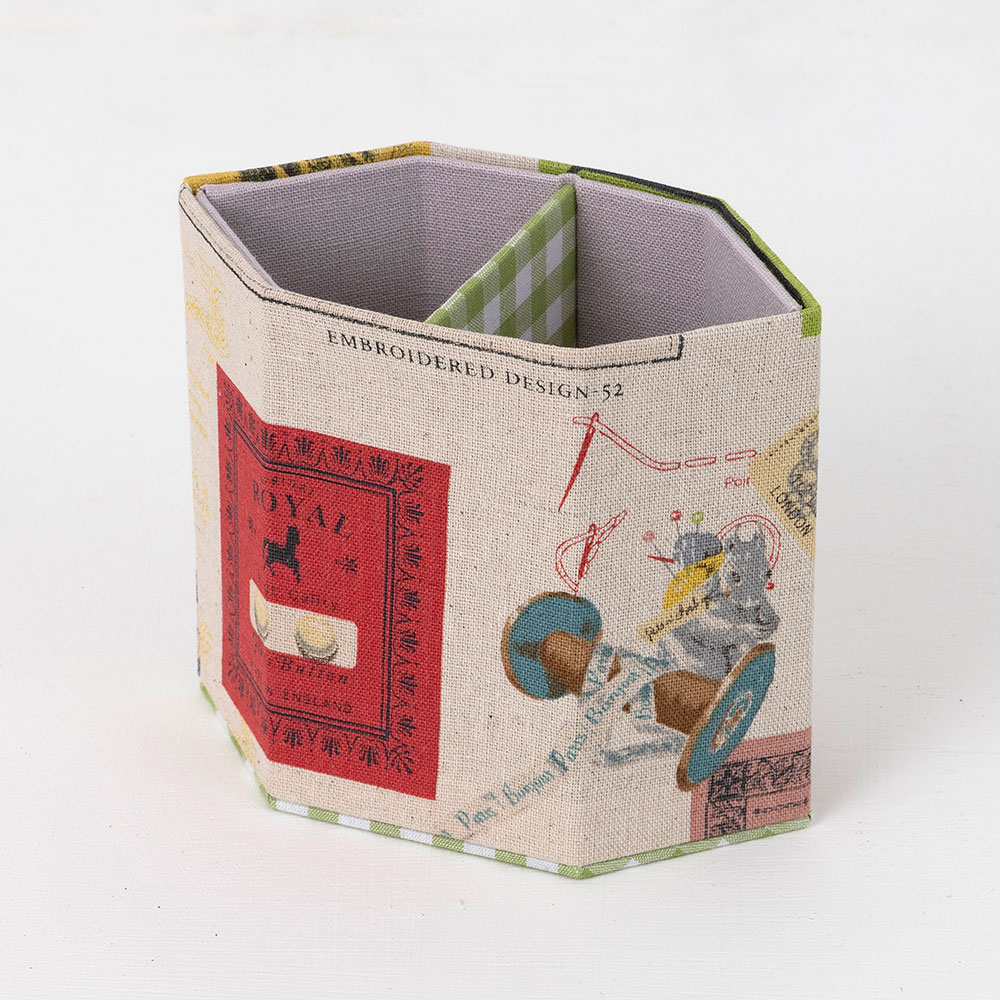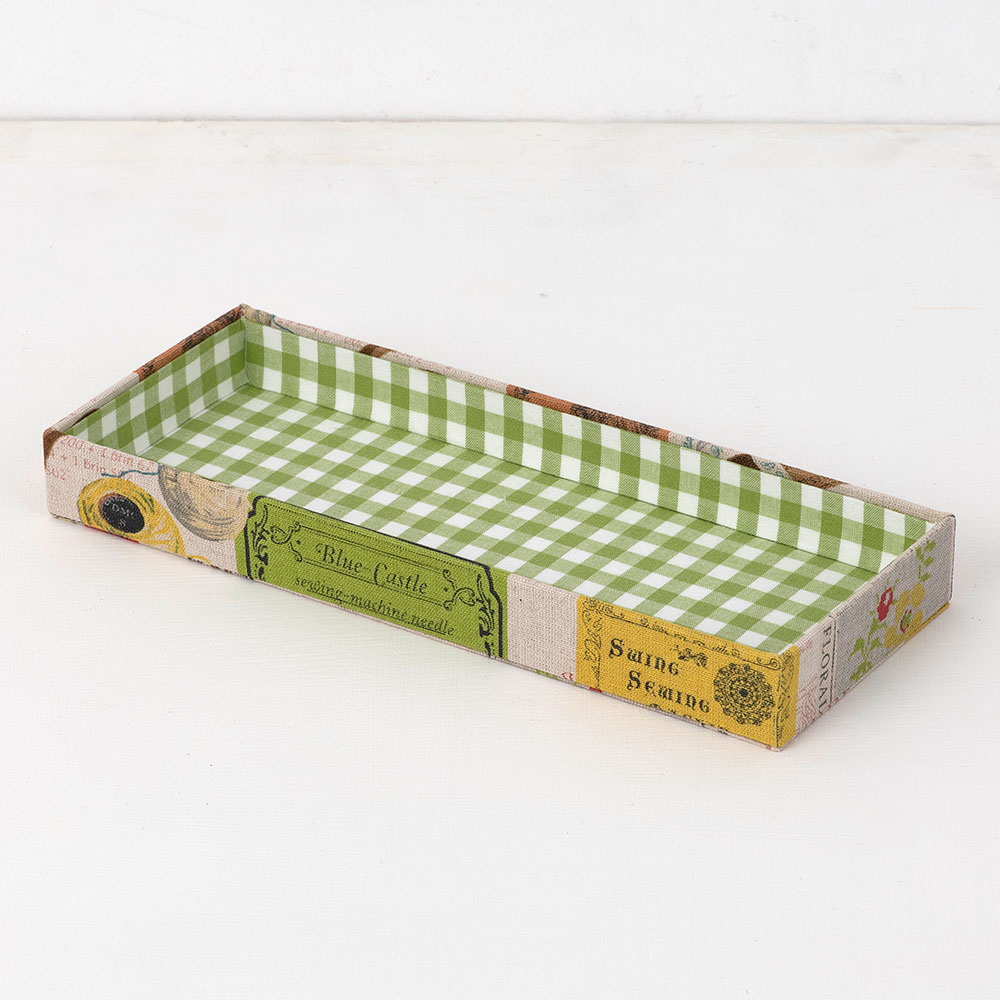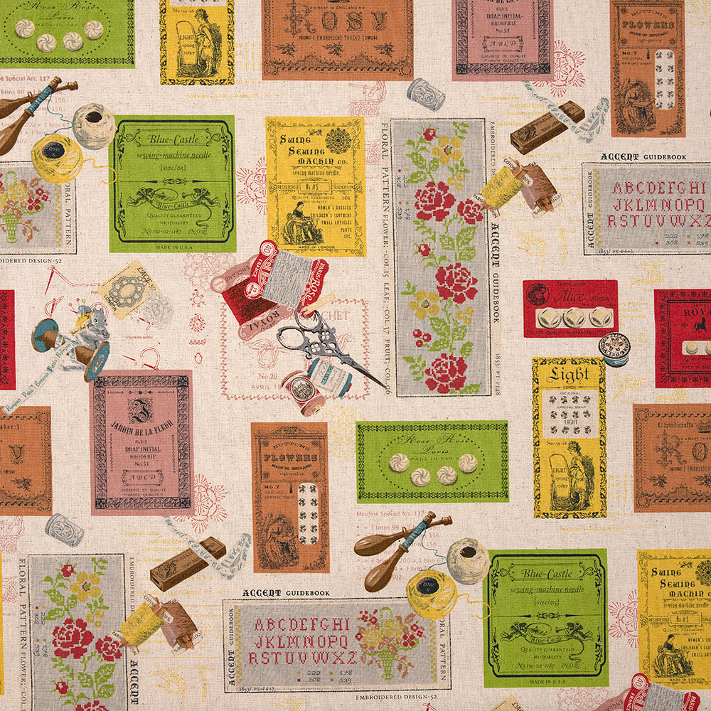 手芸道具がちりばめられた綿麻の生地に鮮やかなグリーンと落ち着いたピンクの生地を組み合わせました。