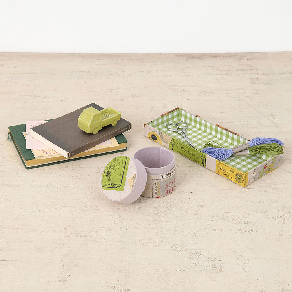 カルトナージュは、厚紙でつくった箱などに、紙や布素材を貼って仕立てるフランス生まれの工芸です。あらかじめ厚紙がカットされたカルトナージュキットを使えば、初心者さんでも安心してお楽しみいただけます。