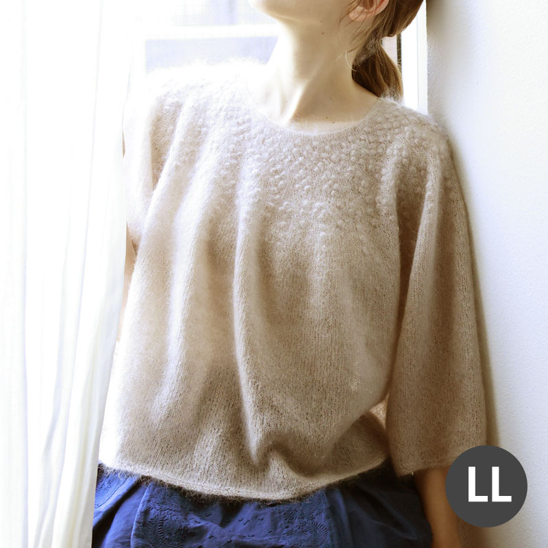 【糸セット】【単品糸購入可能】人気ニット作家michiyoさんの待望「michiyoの4size knitting」より。細めのモヘアで編むシースルーな重ね着用プルオーバーのデザインがまず頭に浮かび、ヨークに何か模様を入れたくて、立体的に浮き出るボッブルをちりばめようと思いました。ボッブルが小さく、たくさんあるので大変ですが、模様が出来てくると楽しいです。袖と身頃にボリュームを出しても、とても軽く仕上がるのが嬉しいモヘアです。ぜひシャツやワンピースに重ねてください。中級。