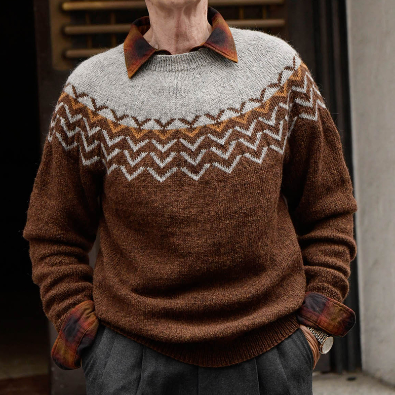 どことなくクラシカルな模様ながら、1列だけ色を変えるなど、今どきなアクセントがおしゃれなデザイン。だんだんと目を減らしながら、模様も小さくなっていく、丸ヨークならではのリズミカルな編み込み模様です。