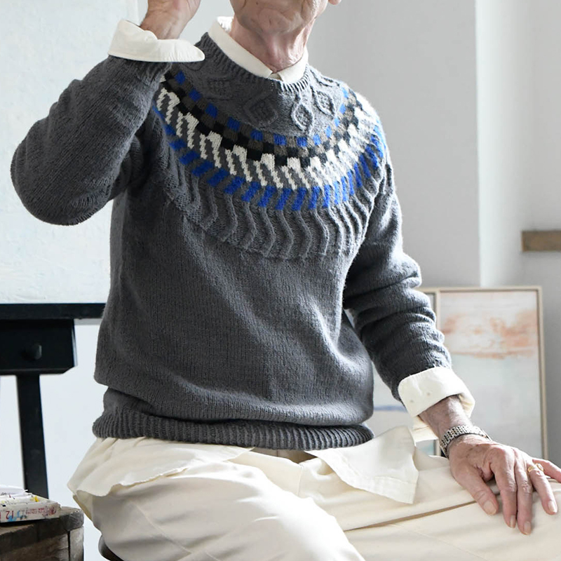 いつものニットスタイルに飽きたらコレがおすすめ。ジェンダーレスでモダンなデザインや色合わせが目を惹くモードな丸ヨークは、動きのある模様と編み込み柄の組み合わせが新鮮です。これを着て出かけたら、褒められること間違いなし。