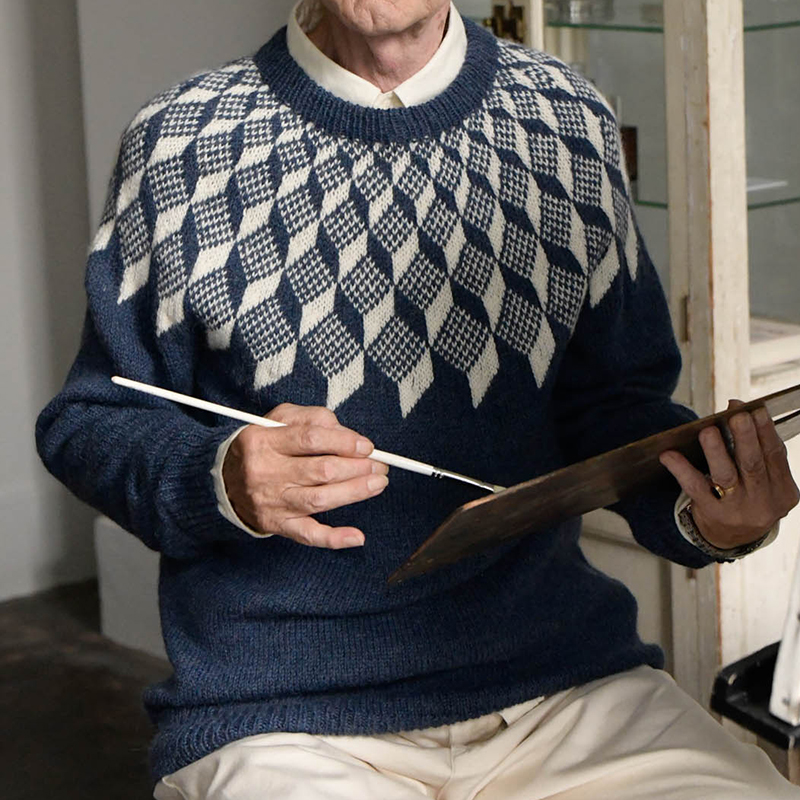 幾何学模様と丸ヨークは相性抜群!徐々に収束していく模様の楽しさに編みながら目を奪われてしまいます。立体的にもツイストされたケーブルにも見えるだまし絵のような面白さもたまりません。