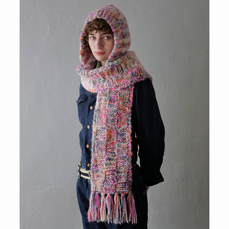 シンプルな形でボリュームたっぷりのフードつきマフラー。フードをかぶっても、ぐるぐる巻いてフードをはずして使っても可愛いアイテムです。