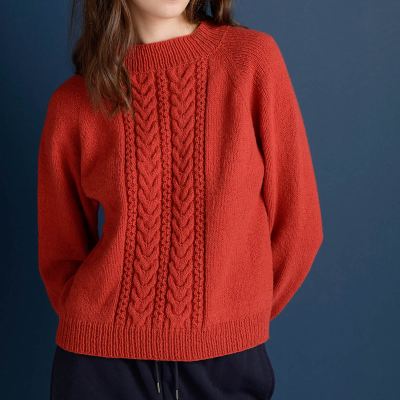 前後身頃の中央に大小のケーブル模様を配したシンプルで着やすいアラン。2 本のケーブルを並べたダブルケーブルをウェーブケーブルでサンドしました。トップダウンで、とじはぎもカット! 超時短のアランセーターです。