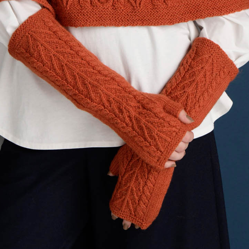 アランの繊細な陰影が美しい、アームウォーマー。生命の木とケーブルは伝統模様にチャレンジするのにも最適です。