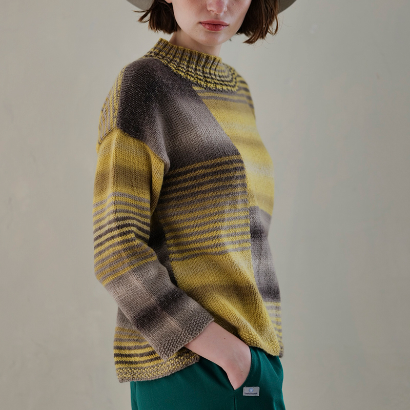 段染め糸を配色することで、深みのあるグラデーションをさらに愉しむ上品で美しいプルオーバー。次々と新しいピッチや色の組み合わせが提案される段染め糸の魅力、余すところなく存分に編み尽くしたい、これからもずっと目が離せない存在です。