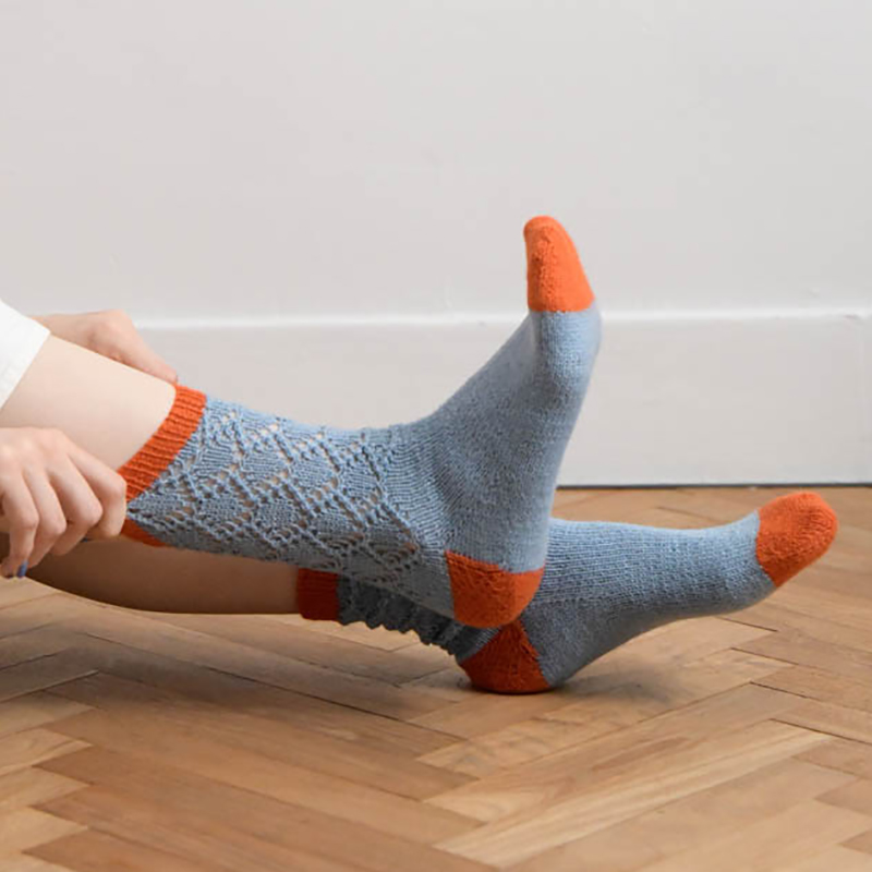 ソックニッターじゃなくても、シーズンに1足は新調したい毛糸の靴下。薄いブルーとオレンジ色の組み合わせ、いわゆるガルフカラーは車由来のツートーンカラーですが、レーシーな模様にもぴったり映える可愛い色です。