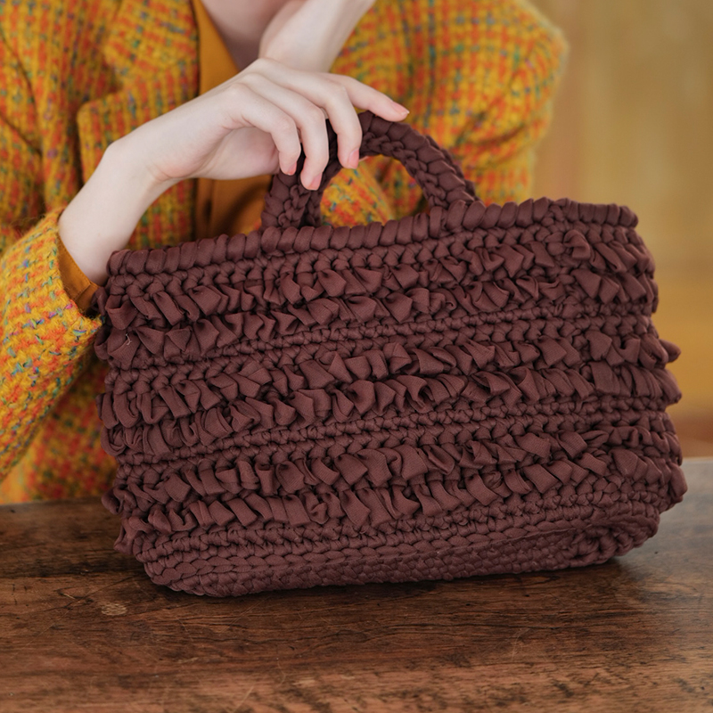 フリルのように並んだ細編みのリング編みが、可愛らしい編み地。こちらの底は、形がきれいに編みあがる楕円形です。後から縫いつけるタイプの持ち手なので、バッグ初心者さんにも分かりやすい仕様です。