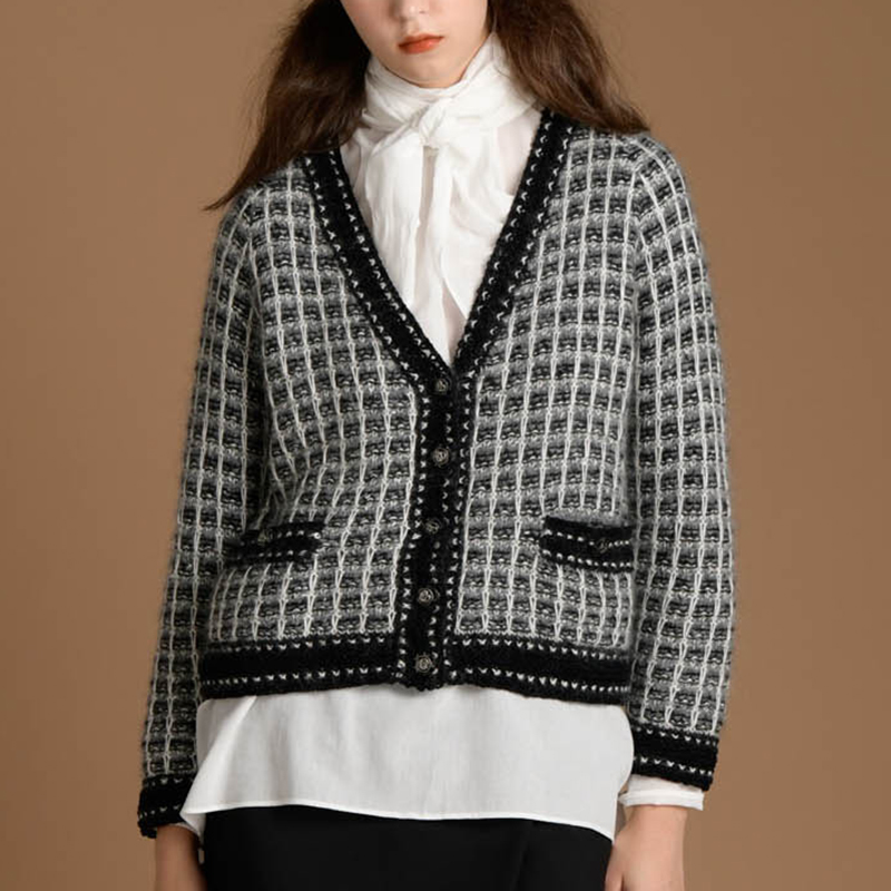 チェック柄を黒のトリミングでピリリと締めて。点線のような白いラインがやわらかさとリズムをプラスします。