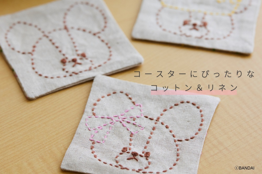 かわいいだけではなく、刺しやすく使いやすいコットンリネンの生地で仕立てます。 通気性が良く肌触りの良いコットンと、水に濡れることで強度が増し、汚れがしみにくく落としやすいリネンが入っています。 布は、漂白や染色をしていない生成りを使用しているので自然で落ち着いた色合いが、テーブルに馴染みます。 ※天然素材の為、茶などの綿カス、麻カスが見られますが自然な風合いとしてご了承ください。