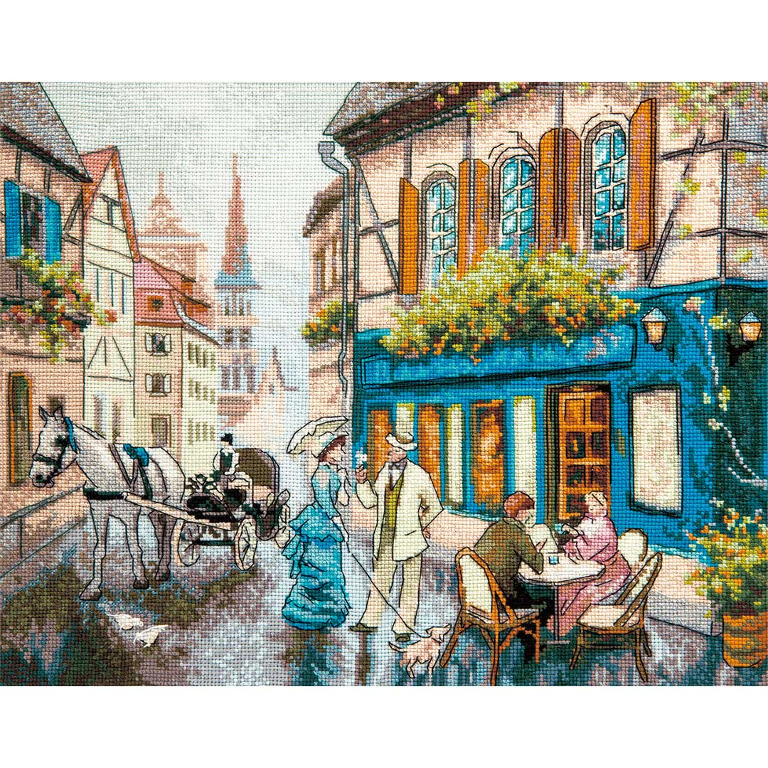 【キット作り方つき】近世のヨーロッパの街並みを描いたクロスステッチ作品。カフェで語らう男女や散歩中のレディー、馬車など、古き良きクラシカルな世界が広がります。上級の方へ。