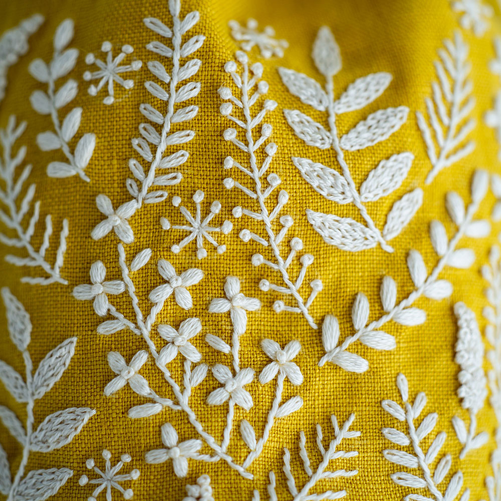 【キット作り方つき】優しい色合いと、ふっくらと刺した花の刺繍が魅力の、yulaさんの著書「yulaの幸せの刺繍」に掲載された作品をキット化しました。 黄色いリネンにオフホワイトの1色刺しで作る、丸底の可愛い巾着。図案印刷済みのリネンが入っているのですぐに刺し始められます。