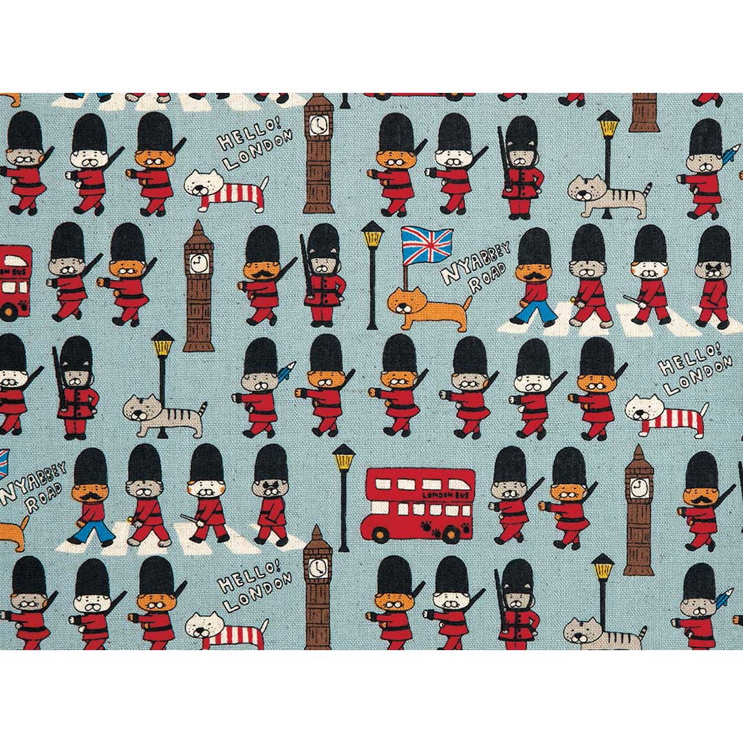 【綿麻キャンバス】綿殻入りの綿麻キャンバス地に、近衛兵姿のネコを描いた、コミカルなプリント布。2階建てバスや“ニャビーロード”などのロンドン名物も登場。やや厚手で、ポーチやバッグ、キッズアイテムなどに使っても。