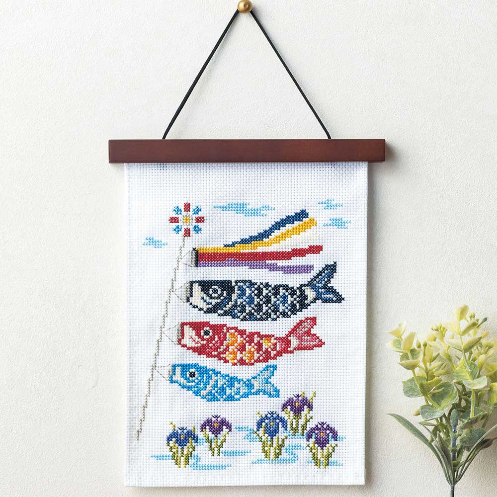 【キット作り方つき】【ウォールバーつき】悠々と空を泳ぐこいのぼりを描いたクロスステッチタペストリーです。木製ウオールバーつきなので作ってすぐに飾れます。初~中級の方向き。