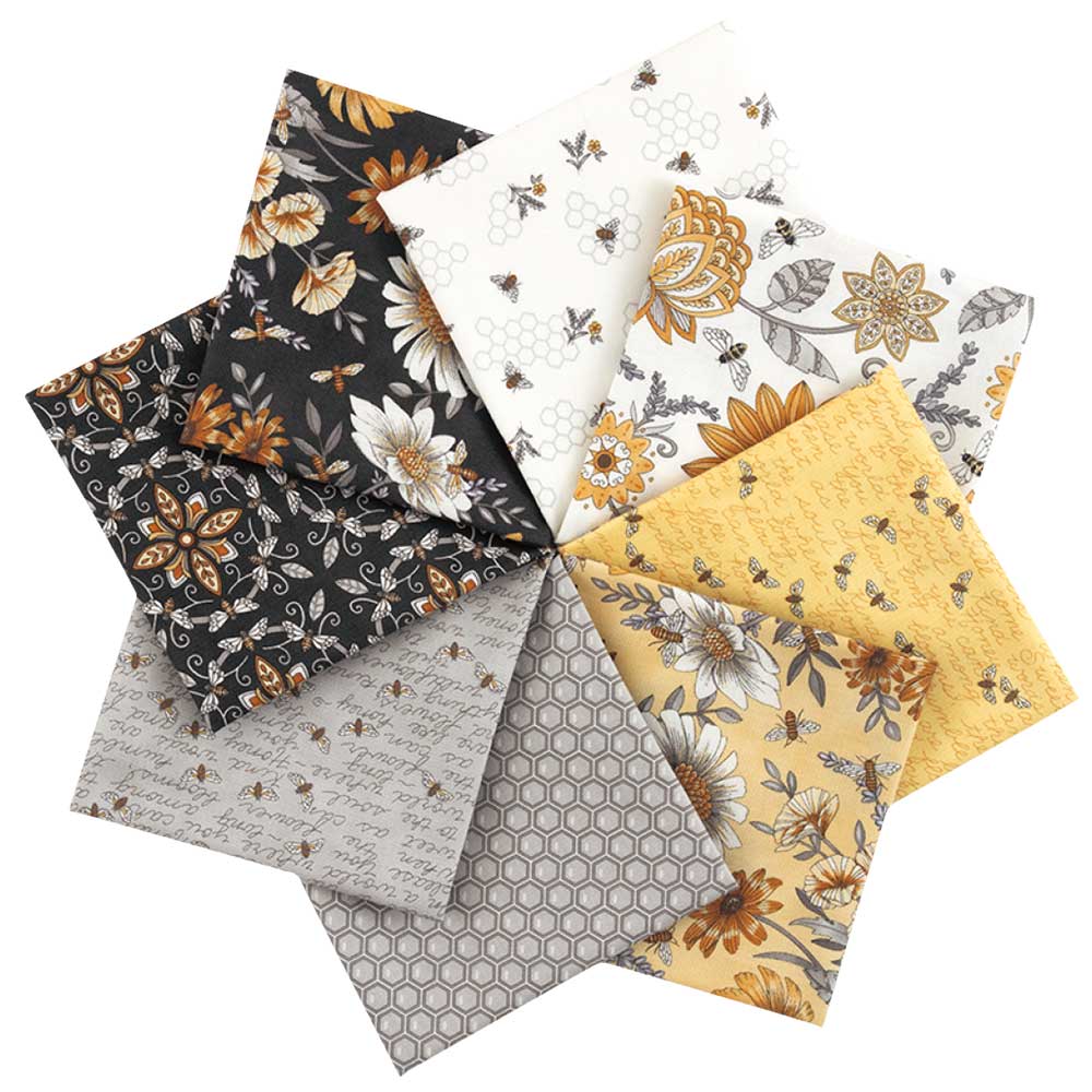 【USA】ミツバチと花々、アクセントにハニカム柄を加えたコレクション。少し抑えたトーンのイエローとグレーで、 シックな雰囲気にまとめました。小さなピースでも個性的な作品に仕上がりそう。