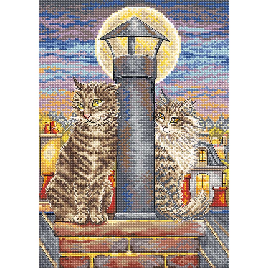 【キット作り方つき】煙突を挟んで寄り添うネコのカップル。ロマンチックなクロスステッチ作品です。上級の方へ。