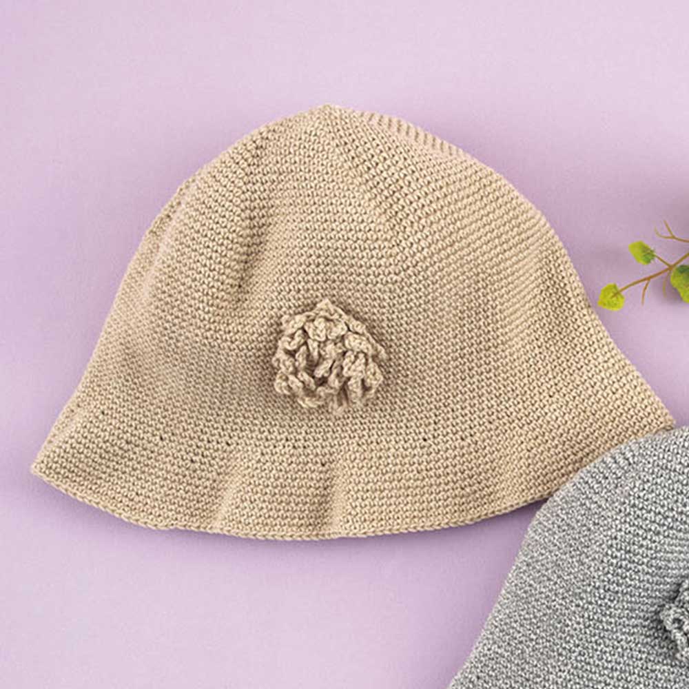【キット作り方つき】トップから細編みでぐるぐると編むシンプルな帽子です。オールシーズン活躍する、上品な色合いのコットンウール糸を使用。折り畳めるので携帯にも便利です。初?中級の方向き。