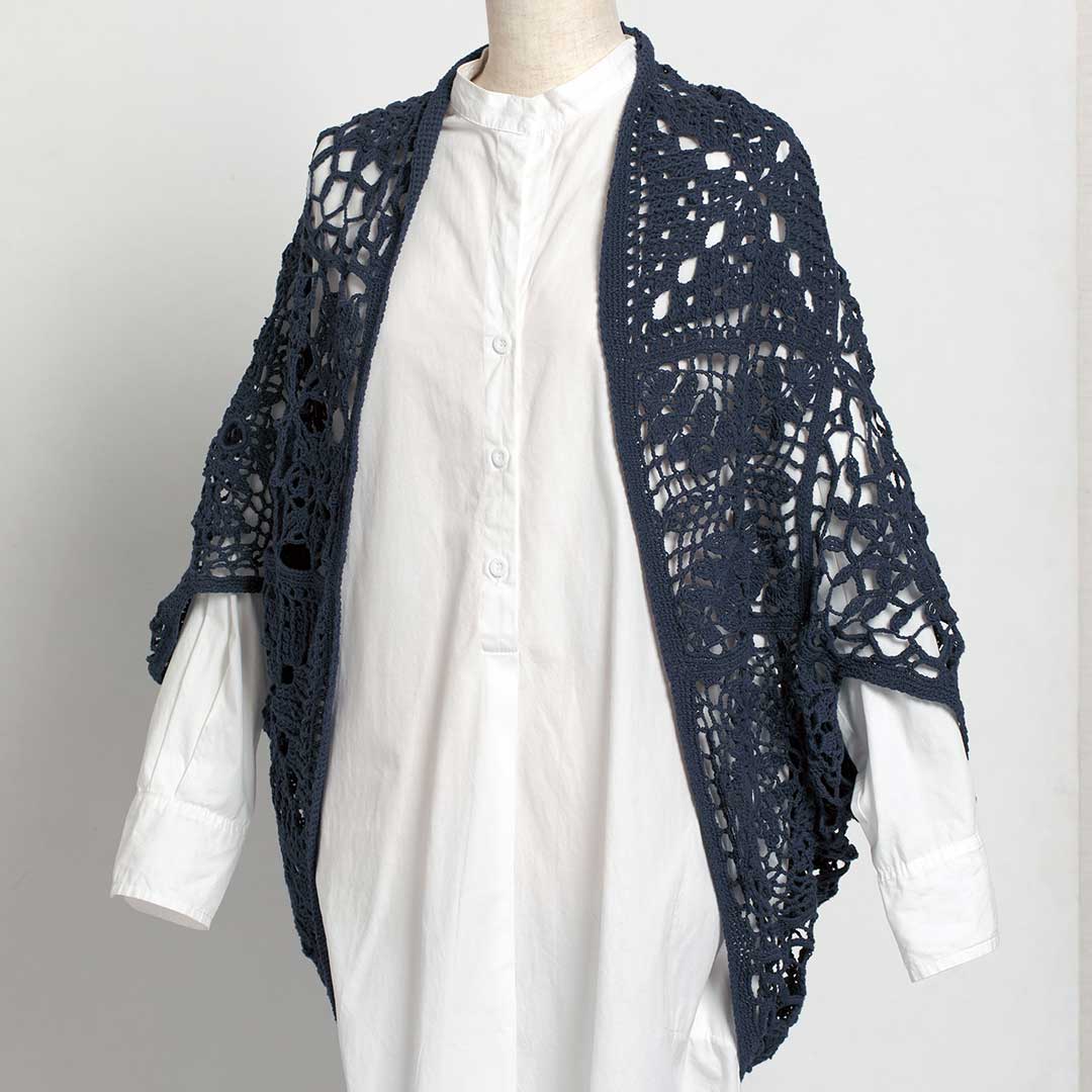 【キット・作り方つき】大胆な四角モチーフのレース編みボレロ。正方形につないだ後、端を合わせて袖を作る簡単仕立てです。ほどよい透け感とコットン混の涼やかな肌触りで、夏も大活躍。上級の方へ。