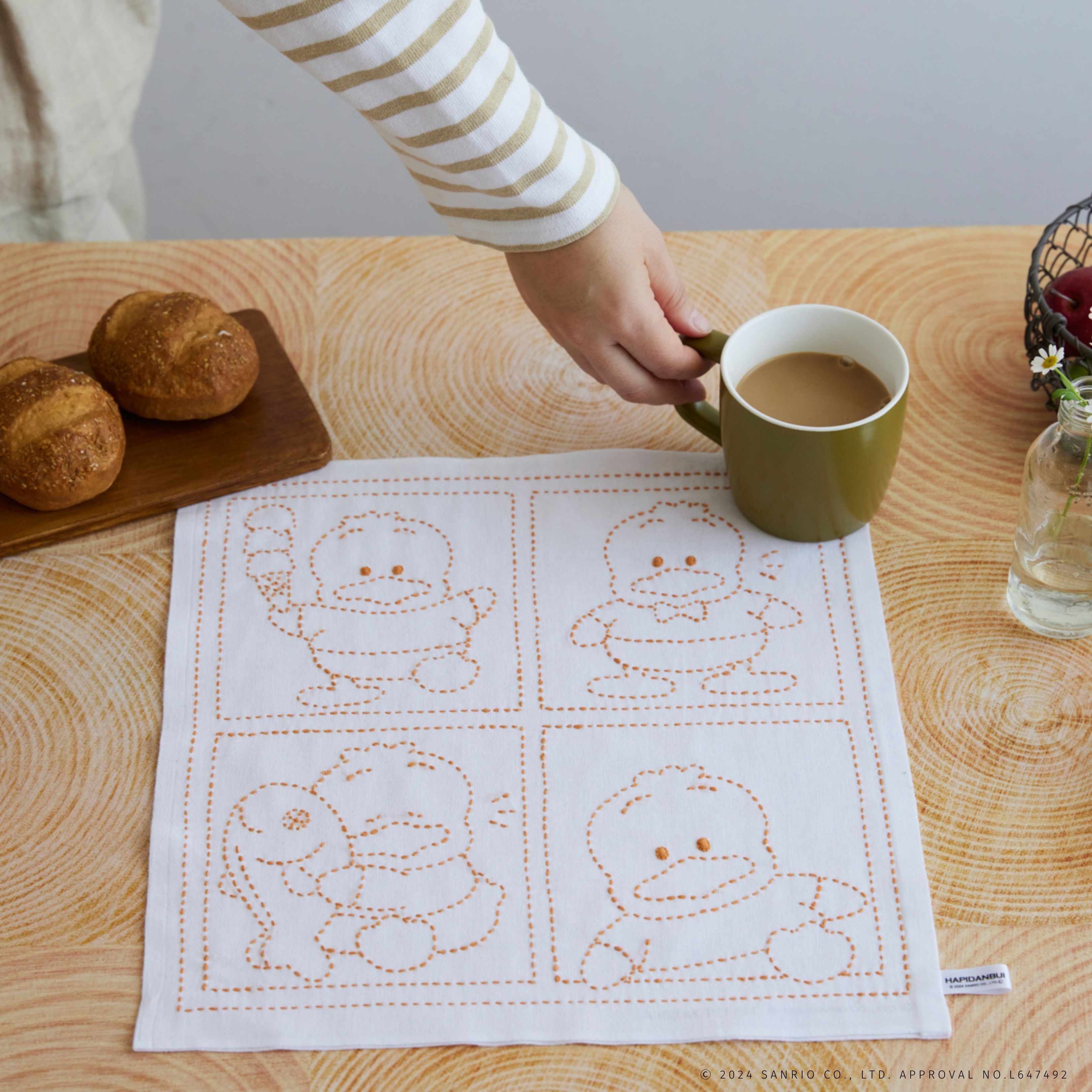 広げたときも、畳んだときも、いつでもキャラクターがかわいく見えるようなデザインにこだわりました。糸は優しい手触りの綿100%で、ふきんに適した糸をセレクトしました。